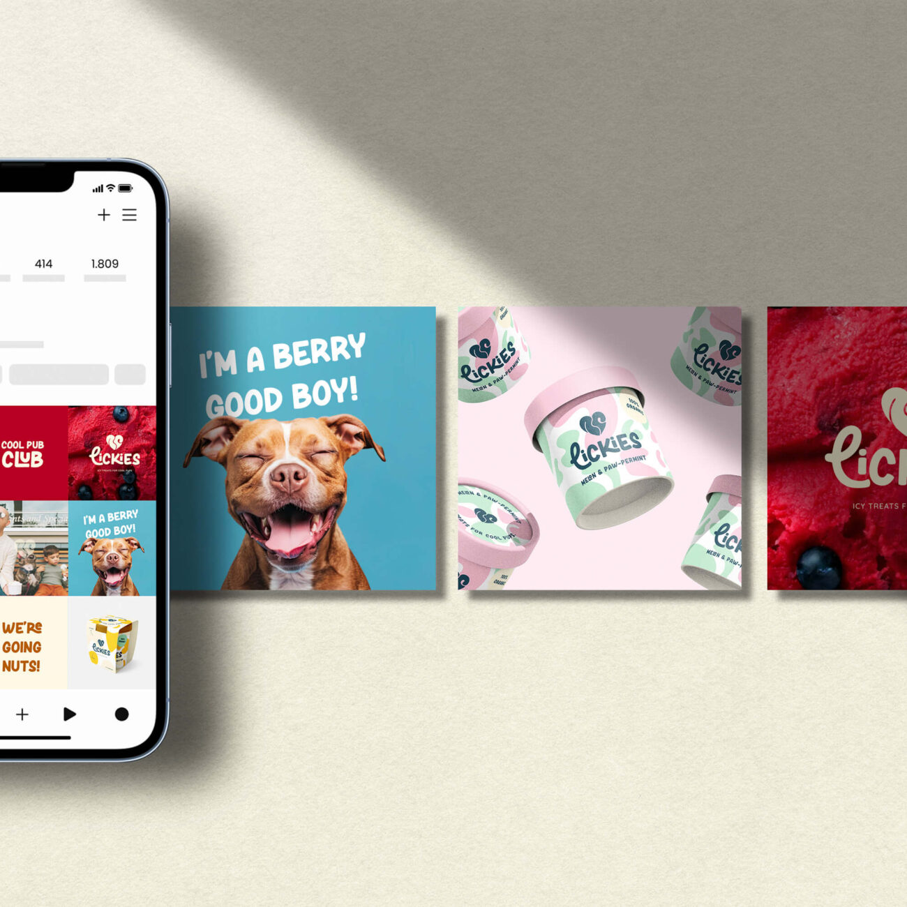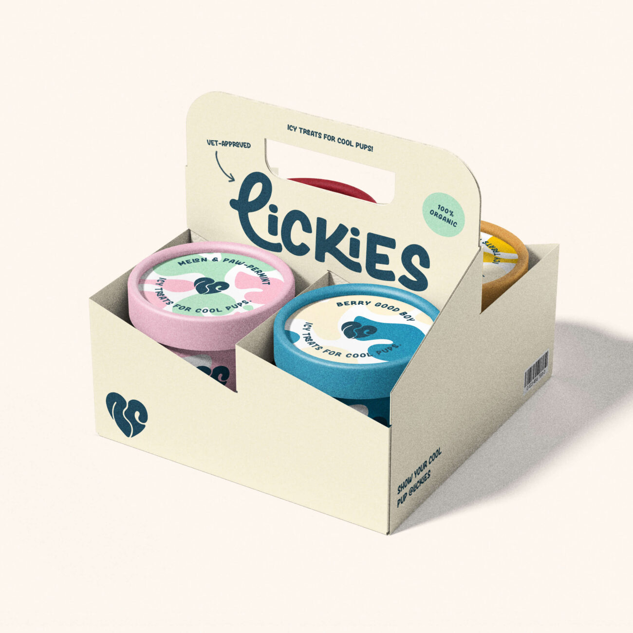 Lickies möchte sich als führender Eiscreme Hersteller für Hunde auf dem Markt positionieren. Bei über 20 ausgefallenen, gesunden Geschmacksrichtungen ist für jede Fellnase was dabei. Die meisten Hundesnack-Hersteller setzen auf rustikale, funktionale Verpackungen – Lickies will einen anderen Weg gehen: clean, cool und durchdacht bis ins kleinste Detail.