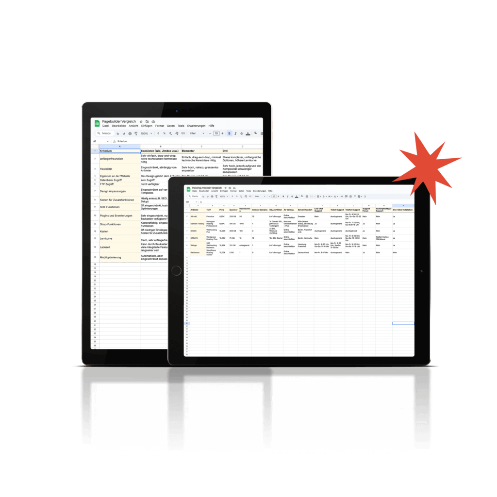 Du willst die Fakten nochmal kompakt vergleichen? Dann hol dir meine beiden Vergleichstabellen für Hosting-Anbieter und Pagebuilder – direkt in dein Postfach. Zwei Google Sheets. Ein Klick. Alles auf einen Blick.